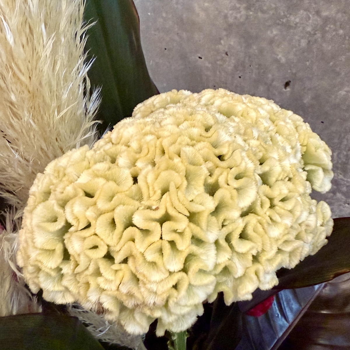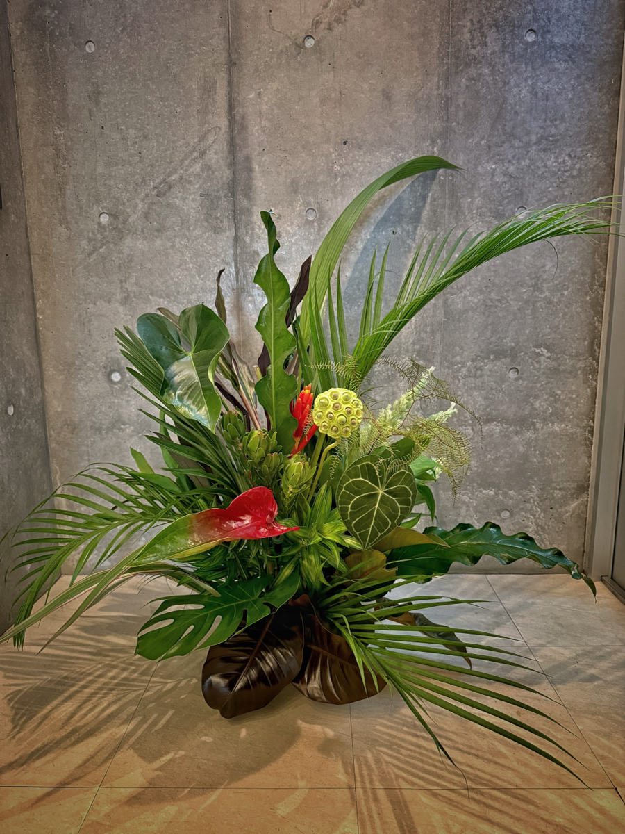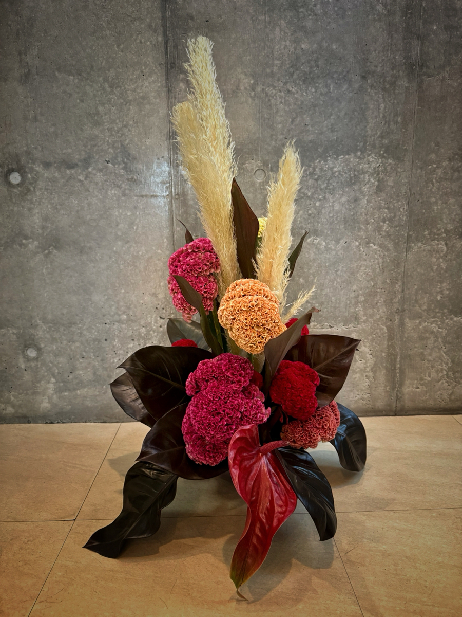 パンパス、ケイトウ、ブラックコンゴ、ドラセナ、アンスリウム