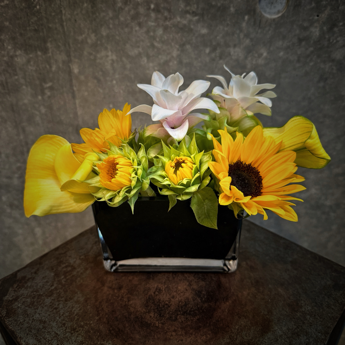 一見、綺麗な黄色のヒマワリとカラーが際立って見えますが、淡いピンクのクルクマも可愛いですね。