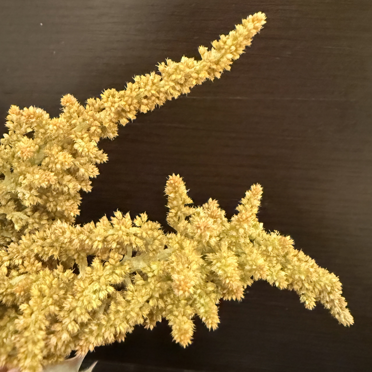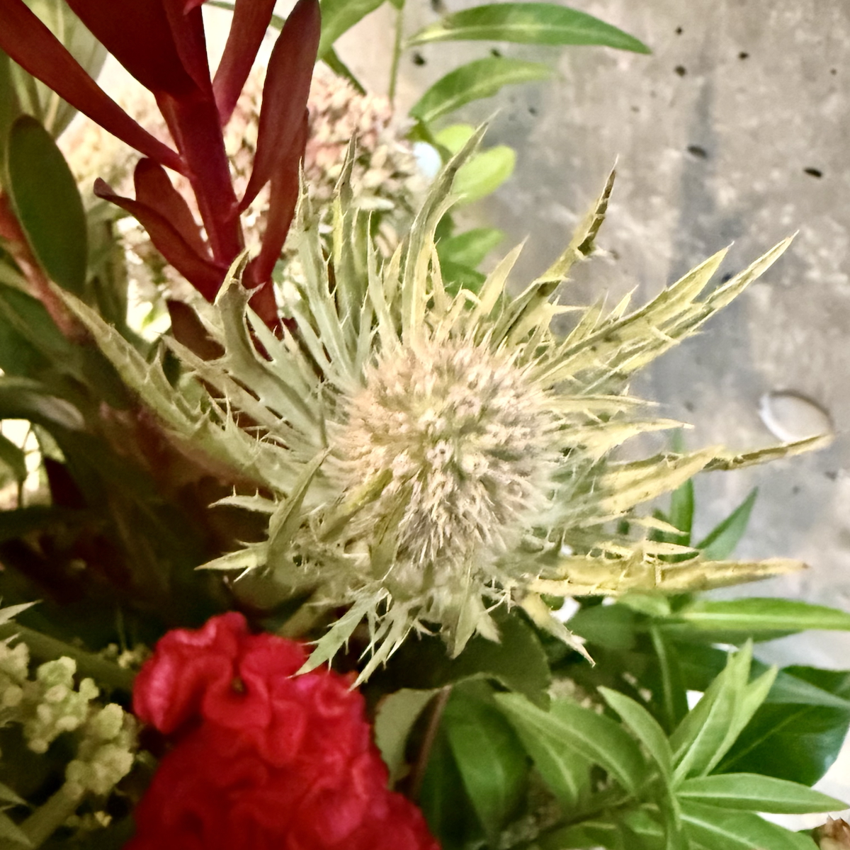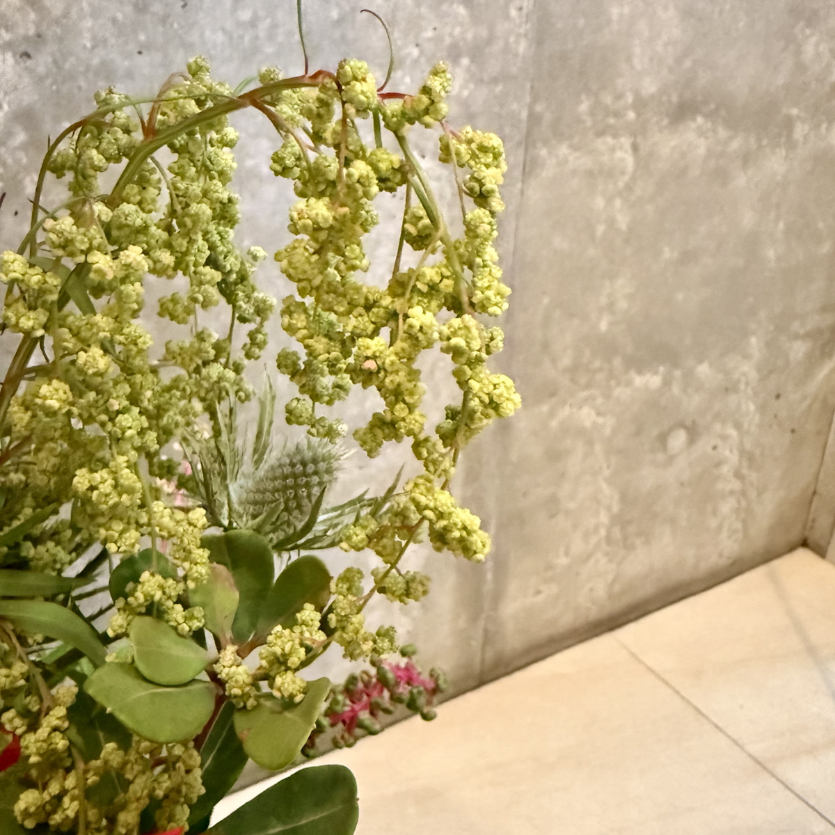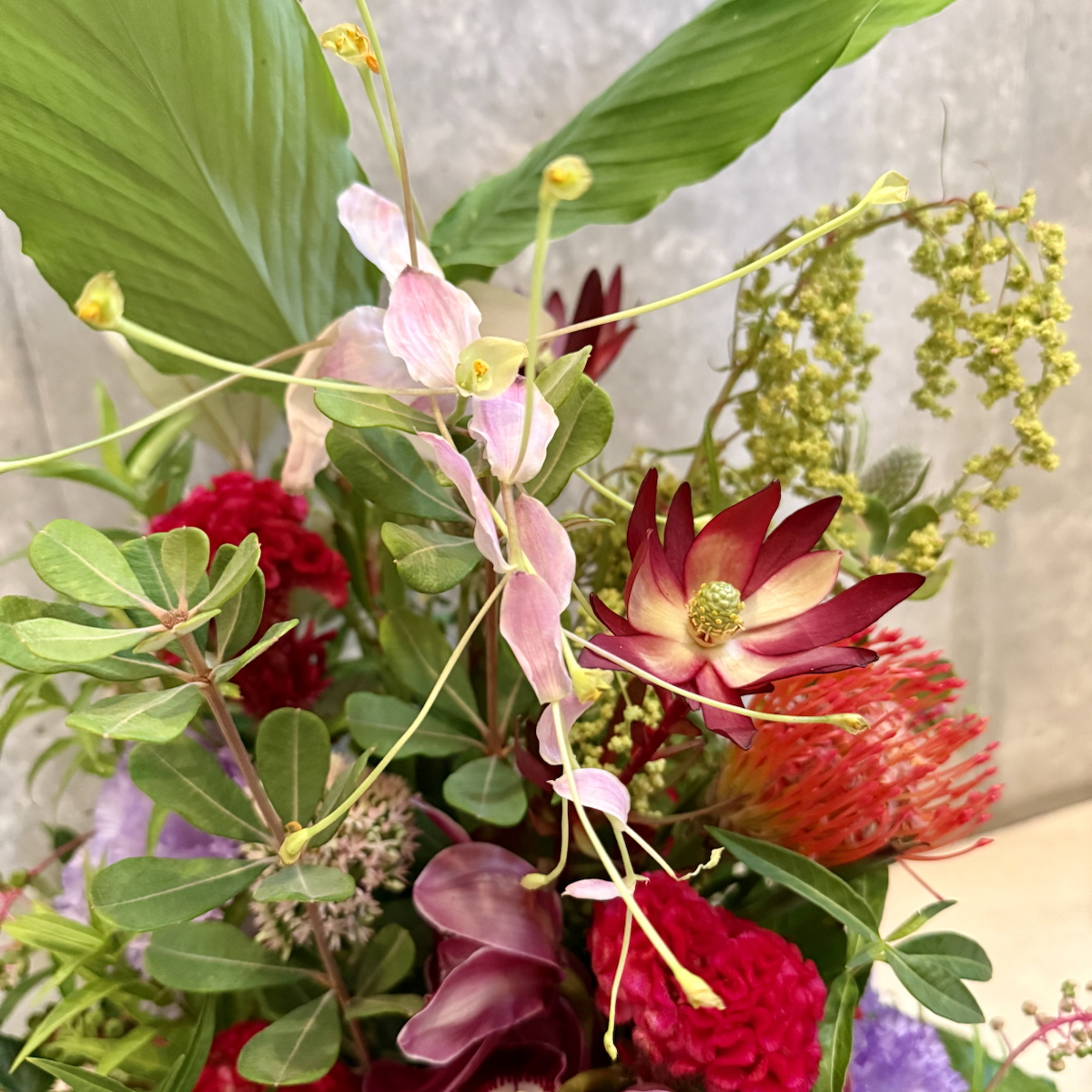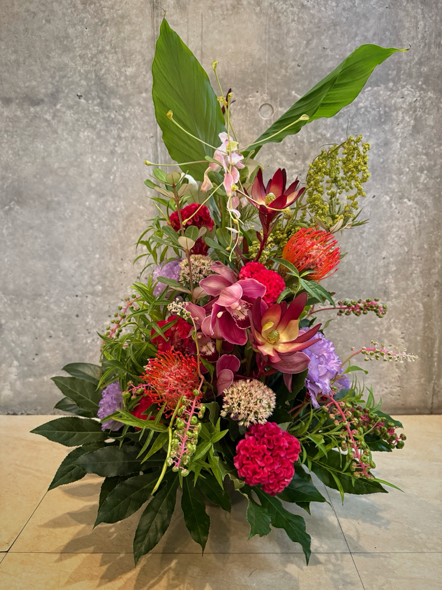 グロッパー、シンビジウム、ピンクッション、ケイトウ、リューカレンドロン、セダム、丁字草、トルコキキョウ、ヤマゴボウ、ヤツデ、バンクシャの葉、エリンジューム