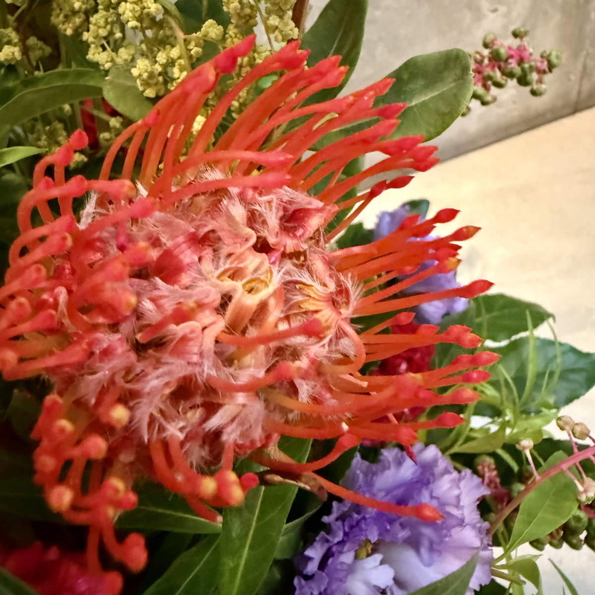 次はピンクッションです。アフリカ原産で花言葉は「成功」「栄光」などポジティブで明るい意味合いが多いです。