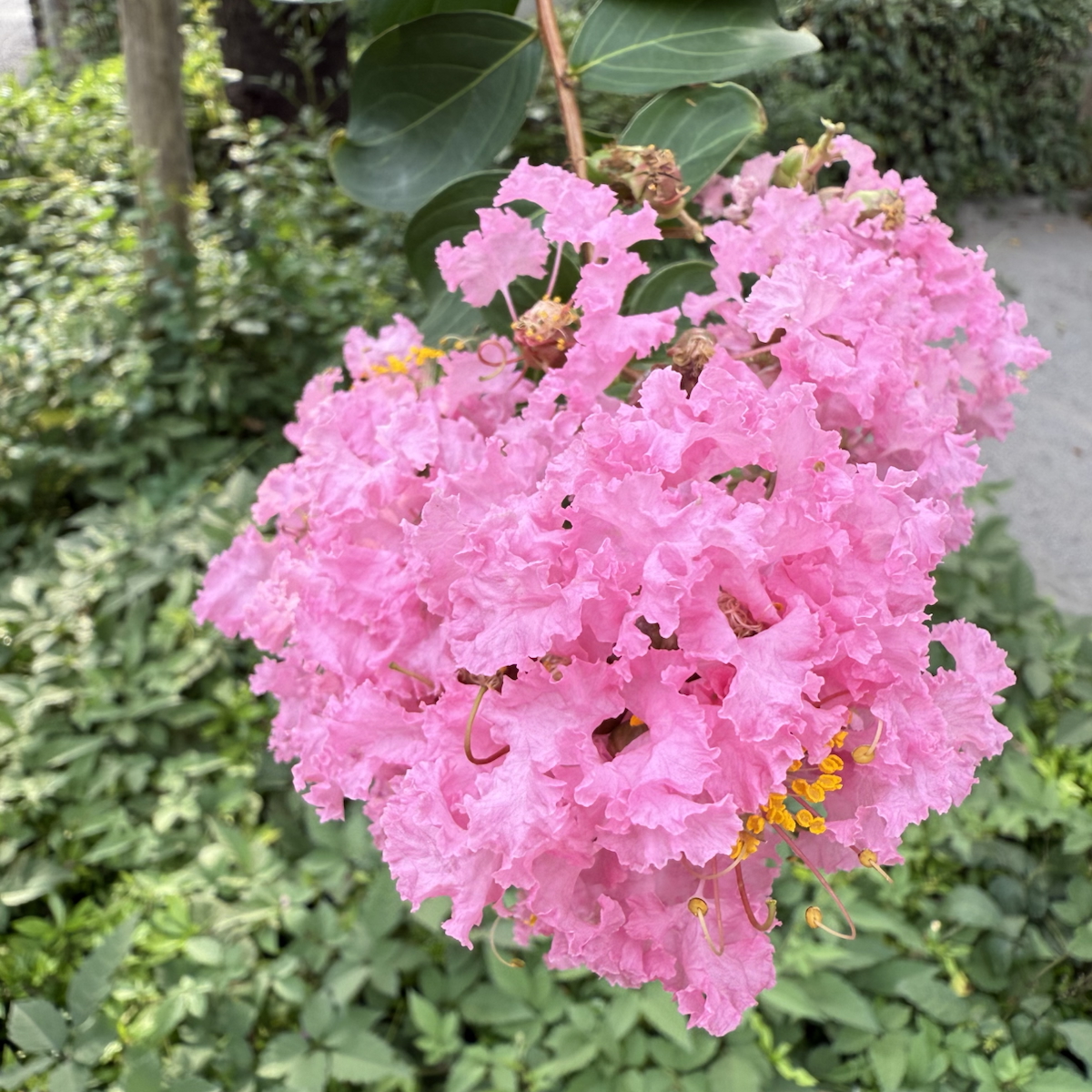 最後はご存知のサルスベリです。木登りが上手なサルでも、滑り落ちるほど樹皮が滑らかという例えから名付けられています。夏から秋の長期に渡って紅色の花が咲きます。