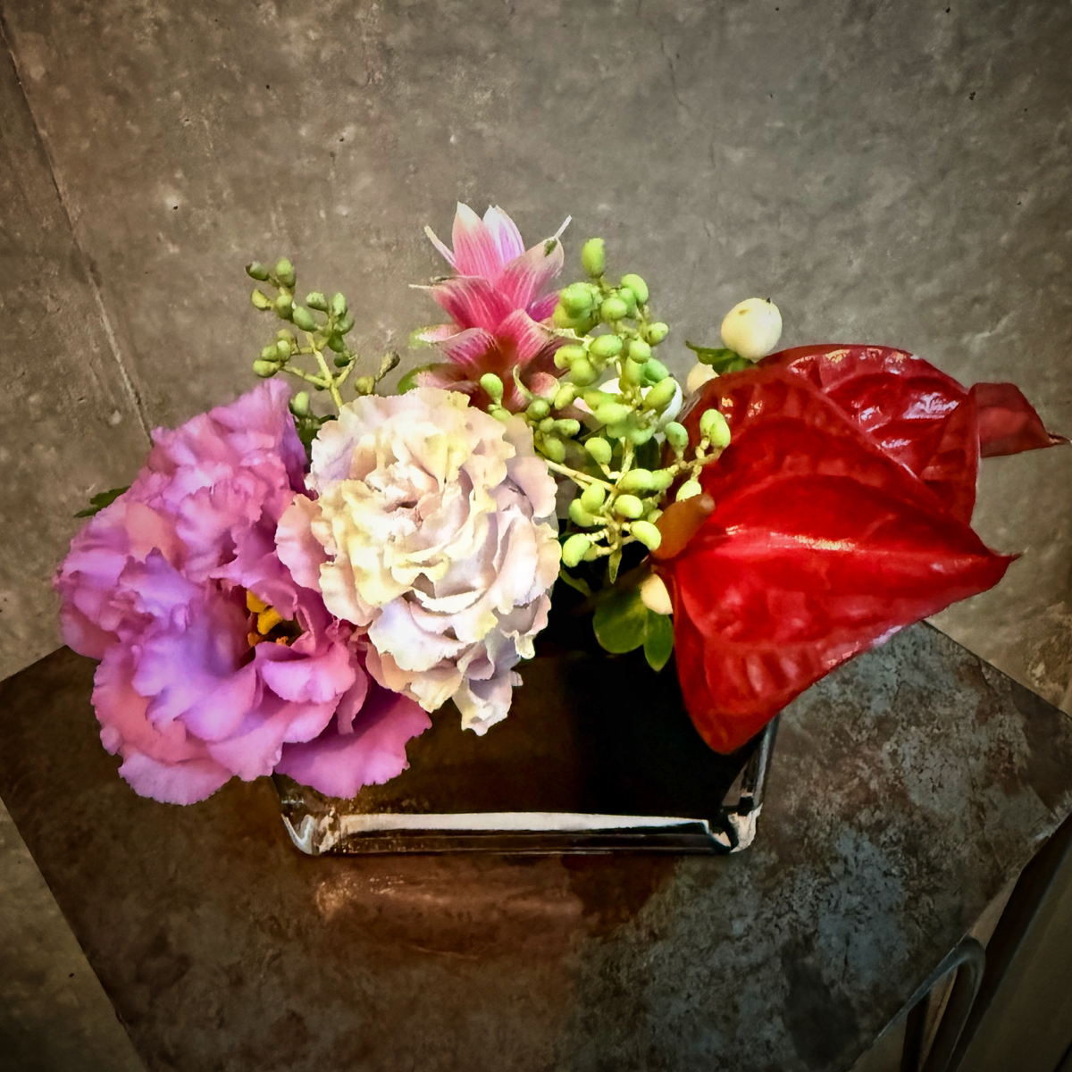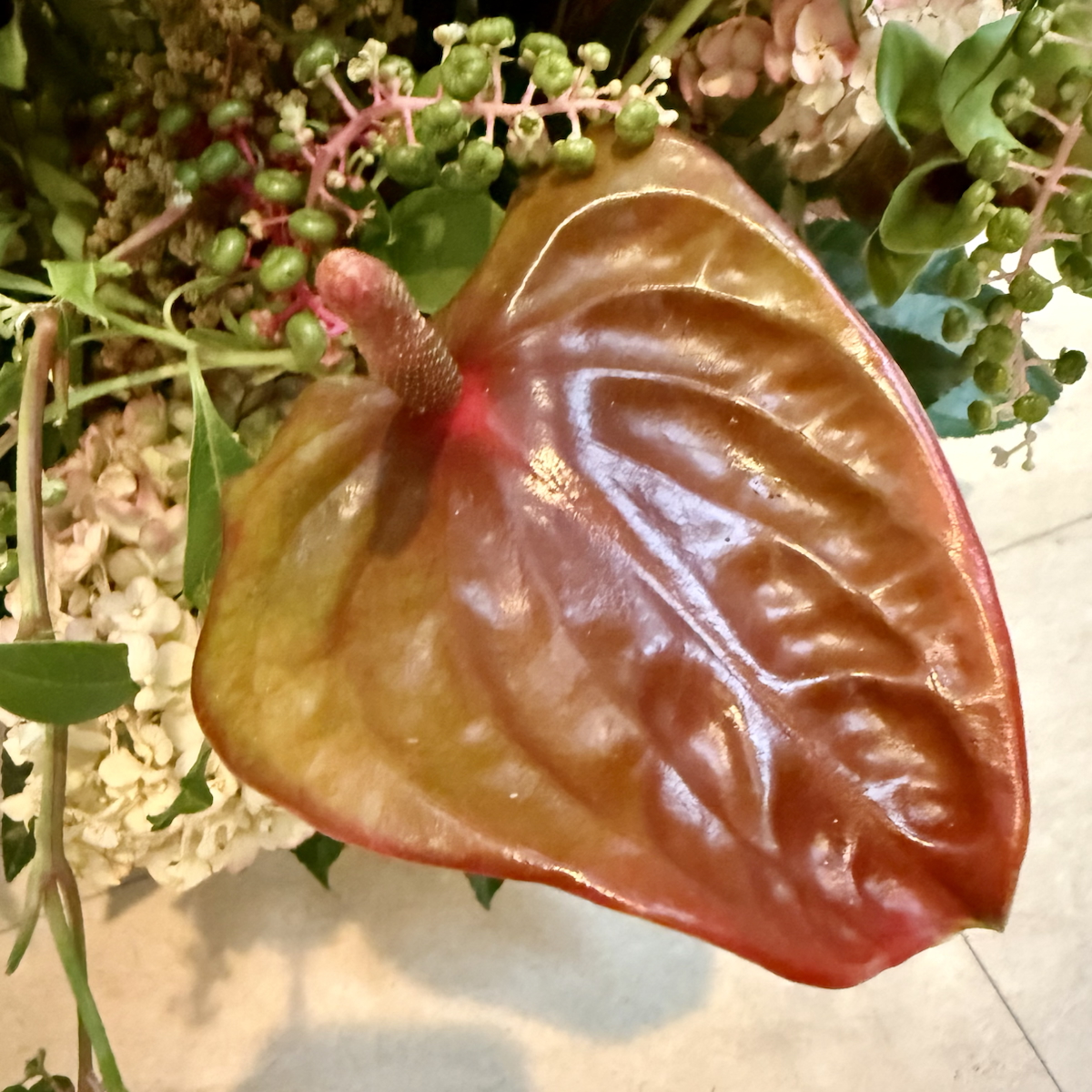 トルコキキョウ、アンスリウム、クルクマ、ネズミモチ、ヒペリカム