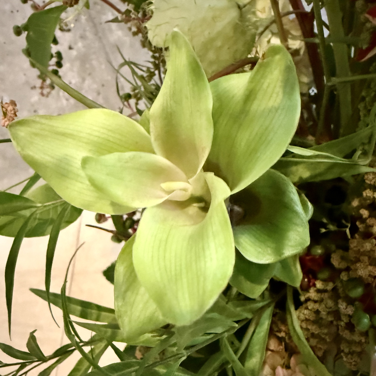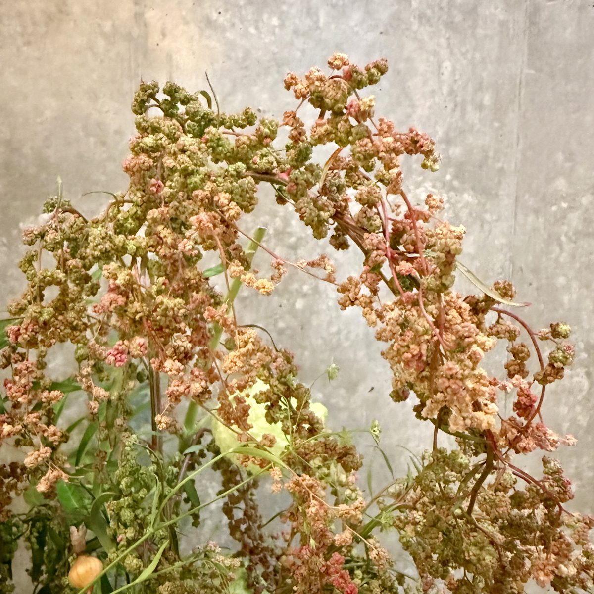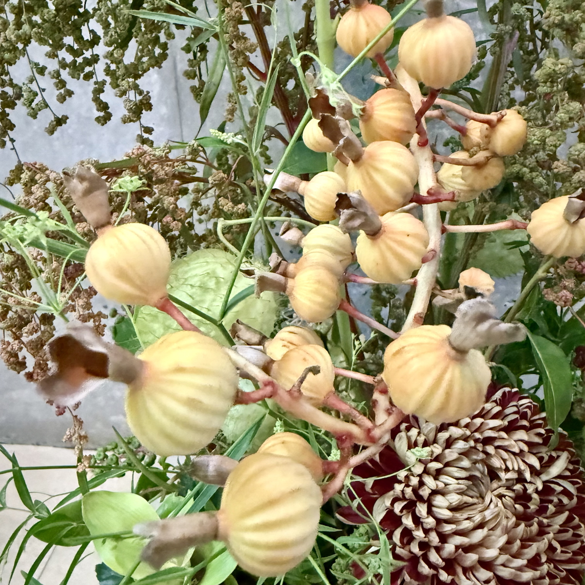 フウセントウワタ、アマランサス、水無月、クルクマ、ヤツデ、ヤマゴボウ、月桃、菊、アンスリウム、丁字草