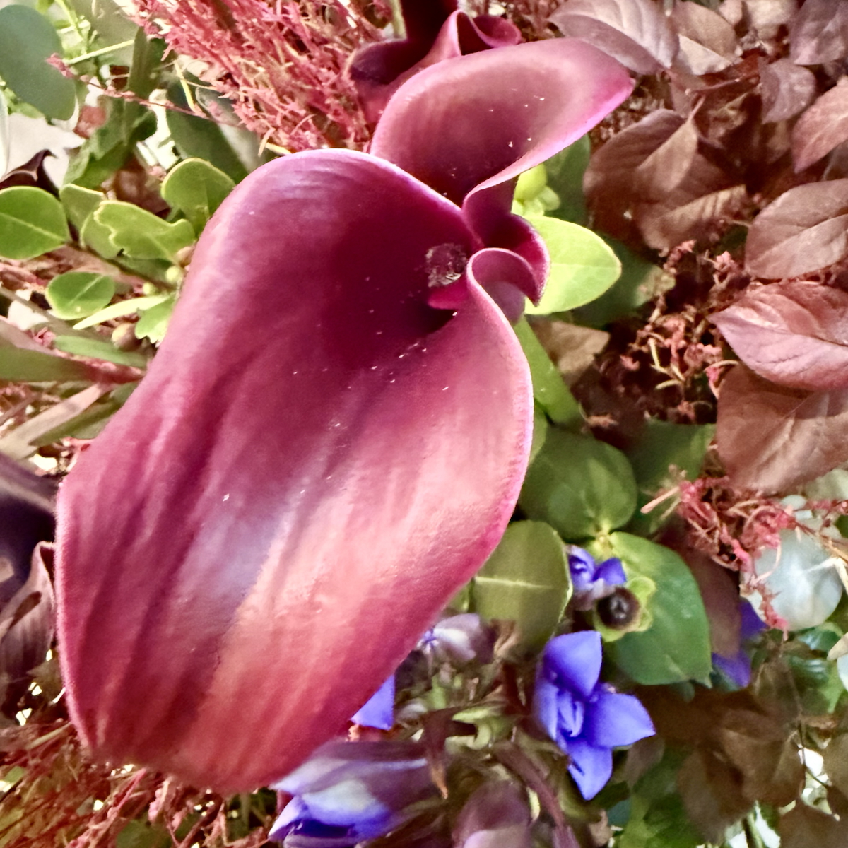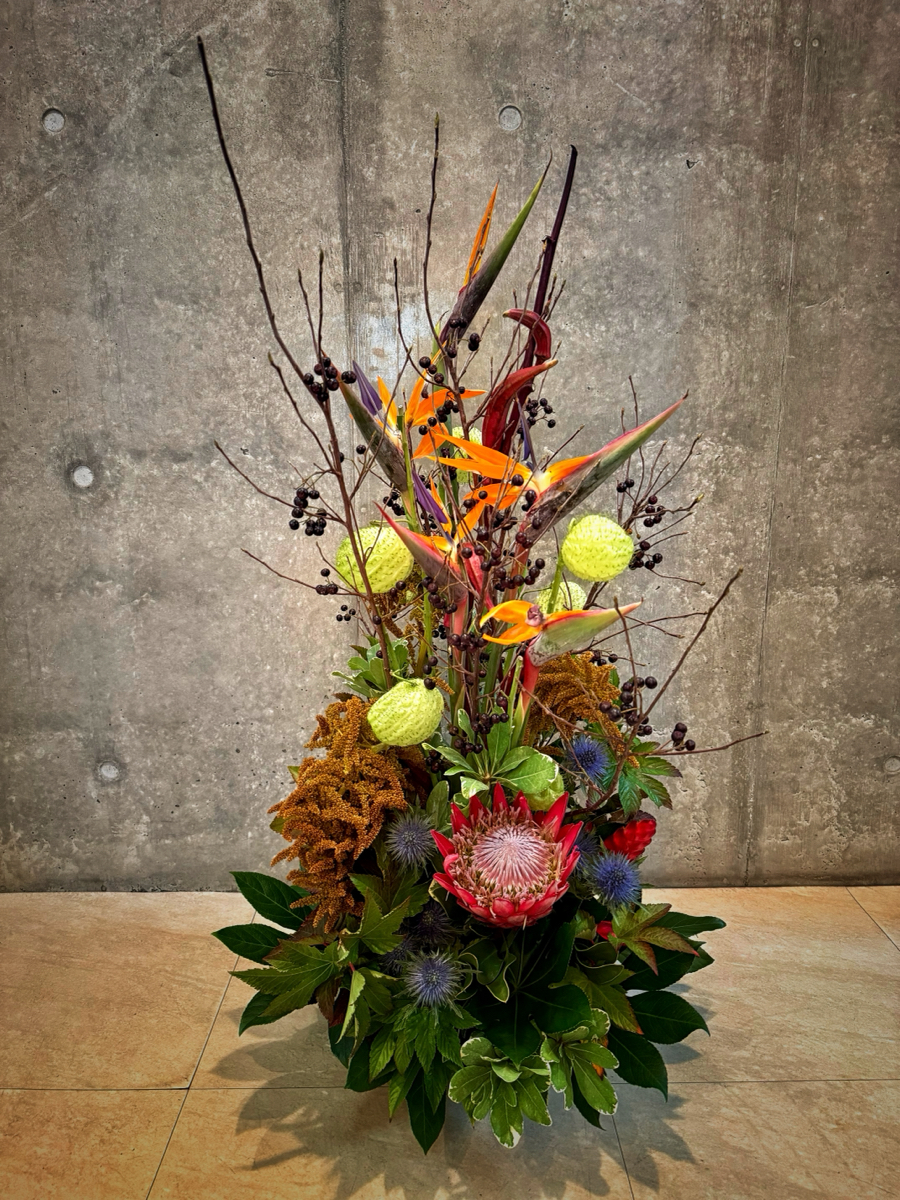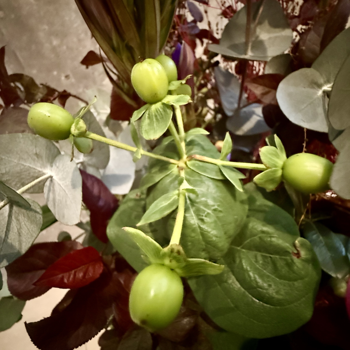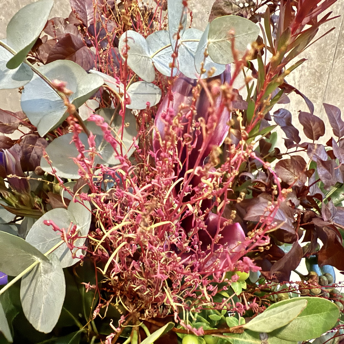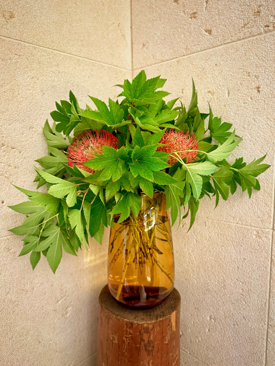 カラー、竜担(リンドウ)、リューカレンドロン、ベニス、ユーカリ、キイチゴ、シャリンバイ、ヒペリカム