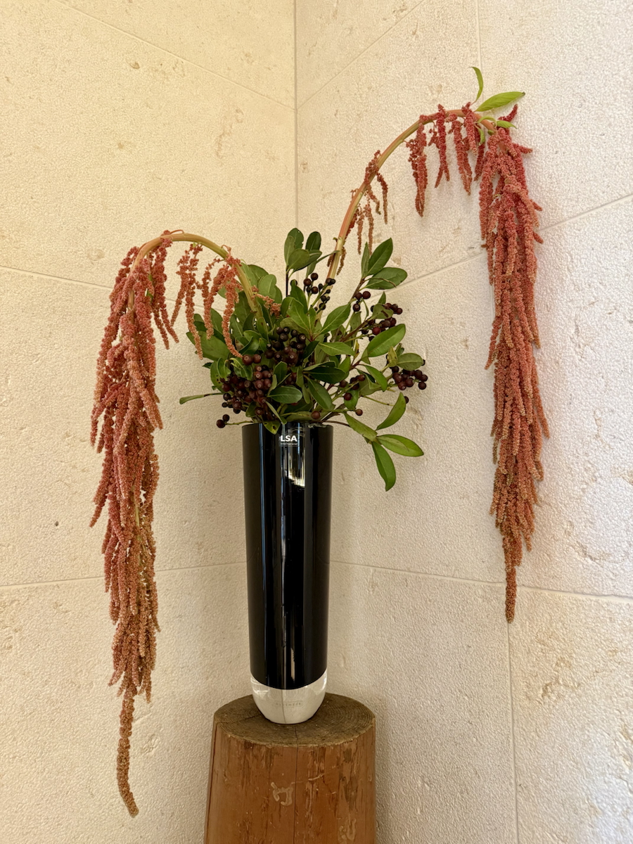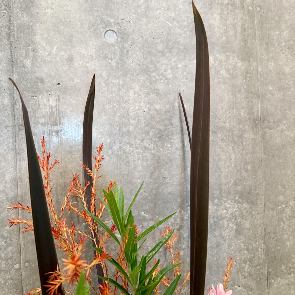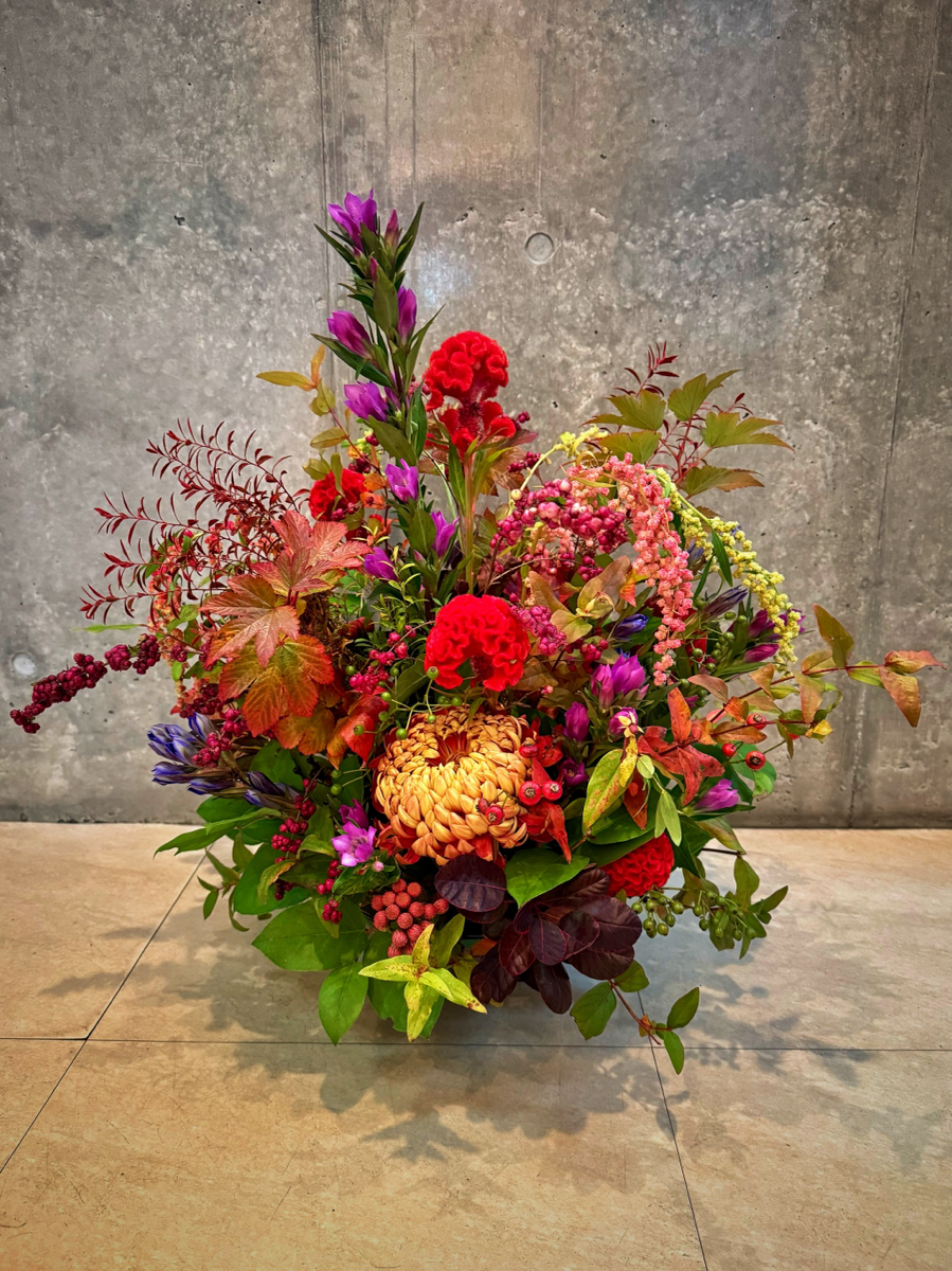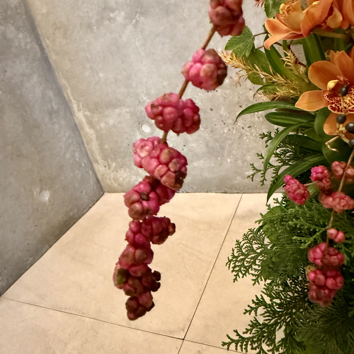 マム、ニューサイラン、メラリューカ、風船トウワタ、石化鶏頭、ドラセナ、クッカバラ、シャリンバイ、桐南天、シンビジウム、キイチゴ、レモンリーフ、ヒバ、ジンジャー、ピンクッション