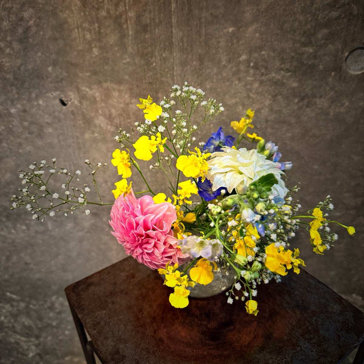 ダリア、オンシジューム、デルフィニウム、ブルースター、霞草