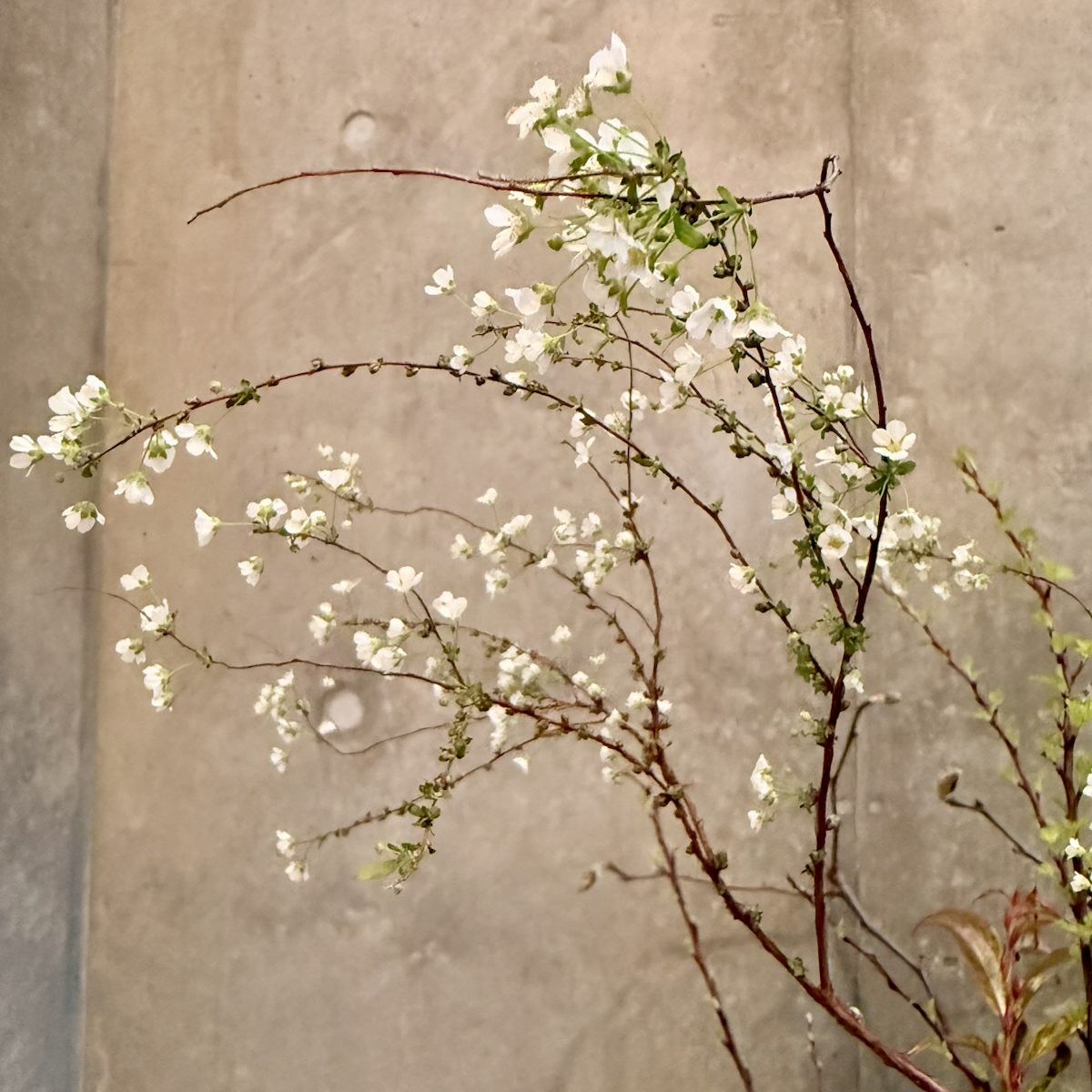 最初はユキヤナギからです。ヤナギのようにしだれる枝に白い小さな花が咲き乱れる様子を雪に見立てて「雪柳」の名がついたそうです。
