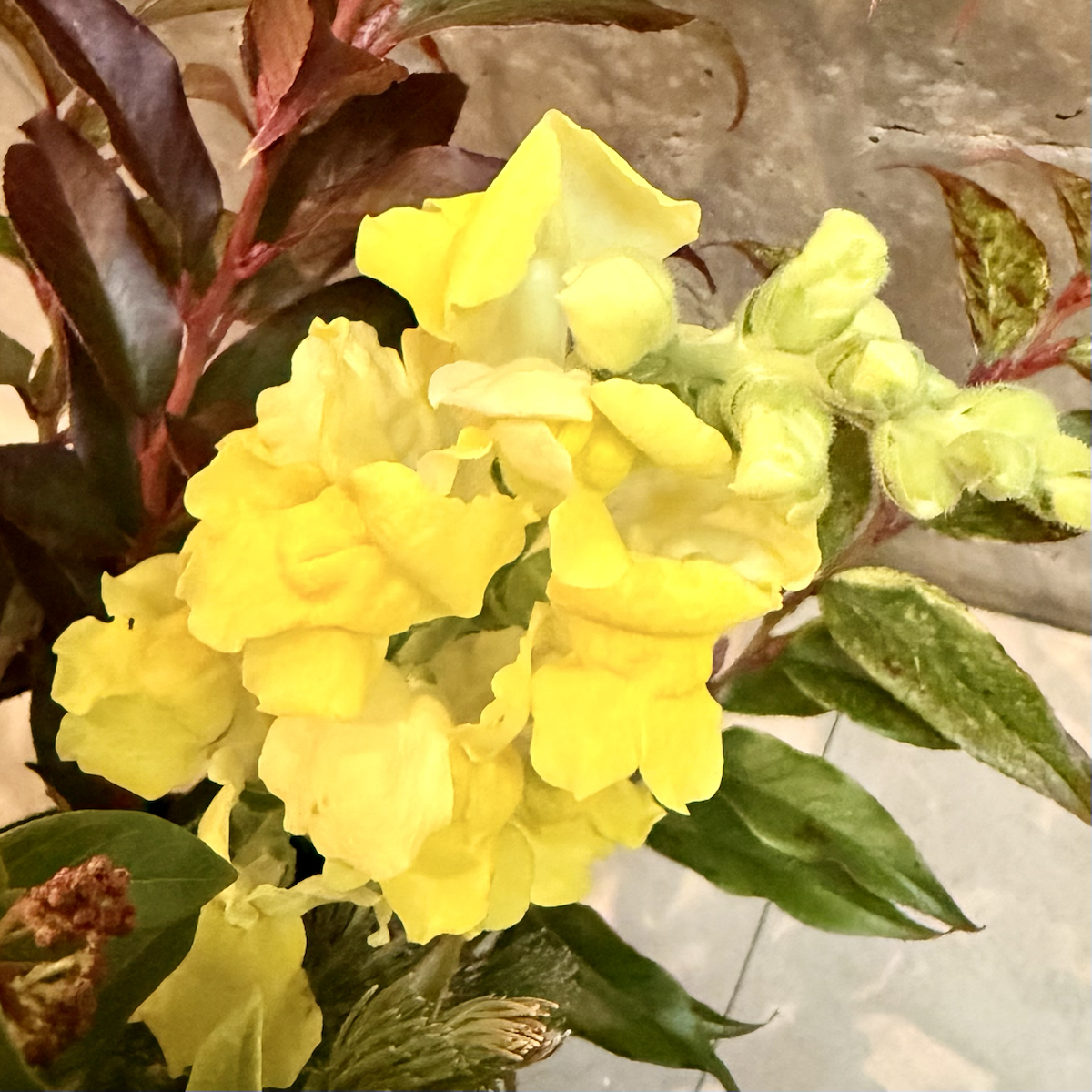 この黄色い花はストックと言い、花言葉は「求愛」「永遠の美」です。