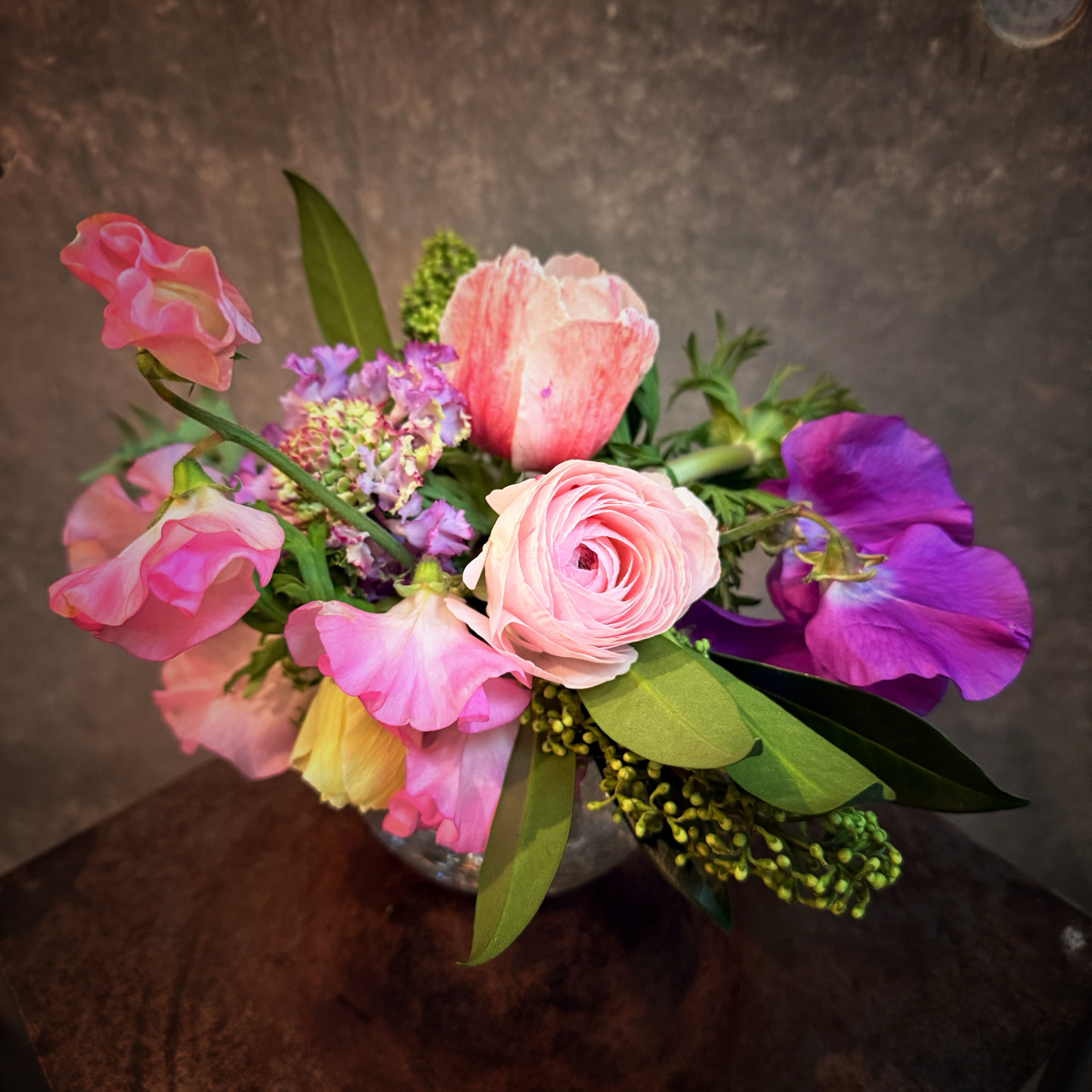 紫色のアネモネとスカビオサ、ピンク色のラナンキュラス、小さいのがコデマリです。
