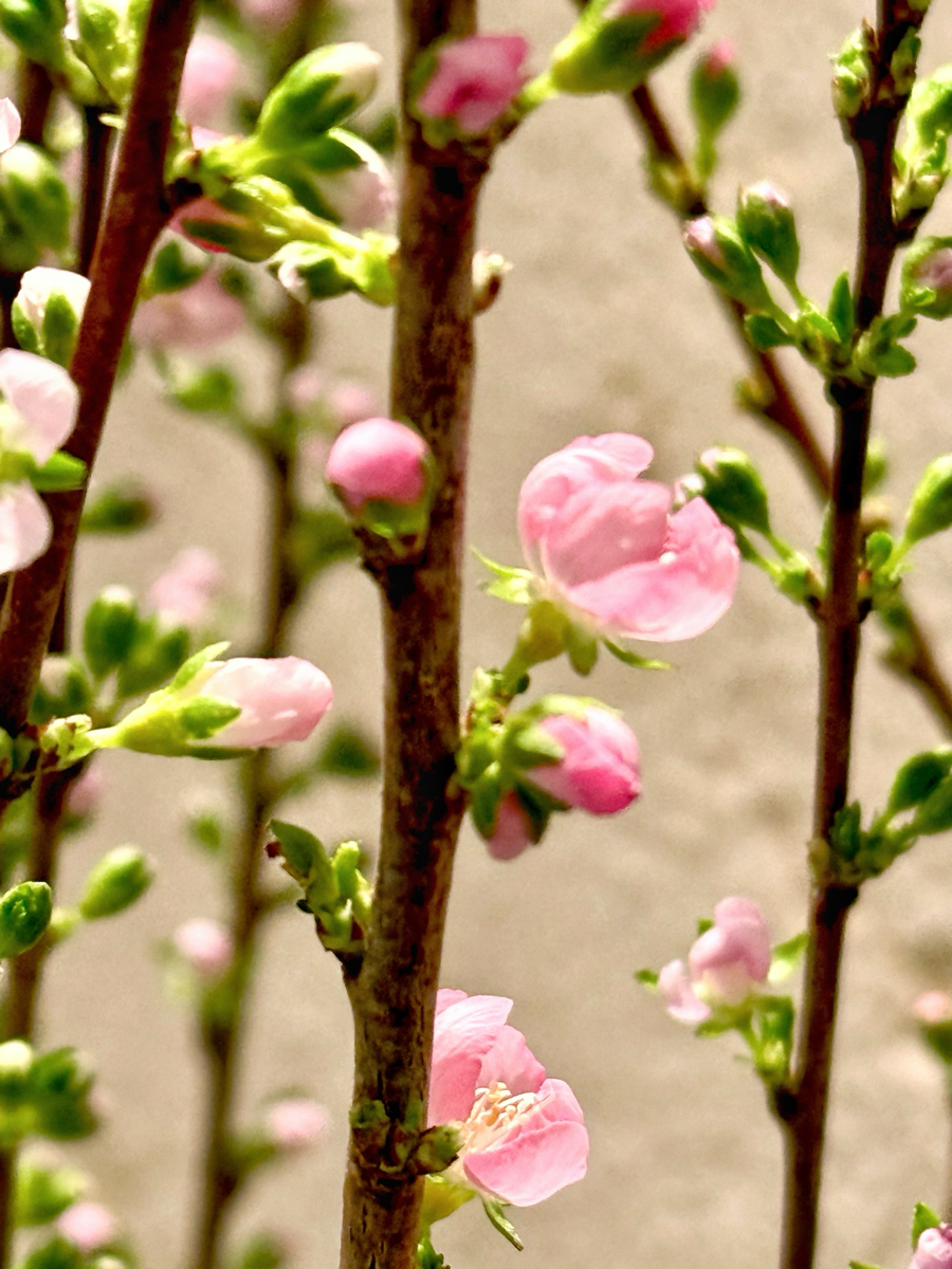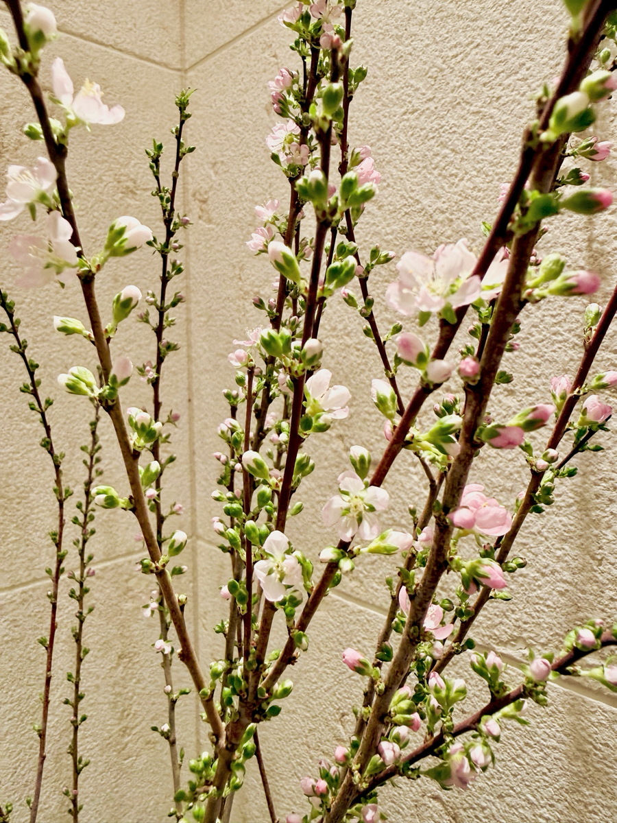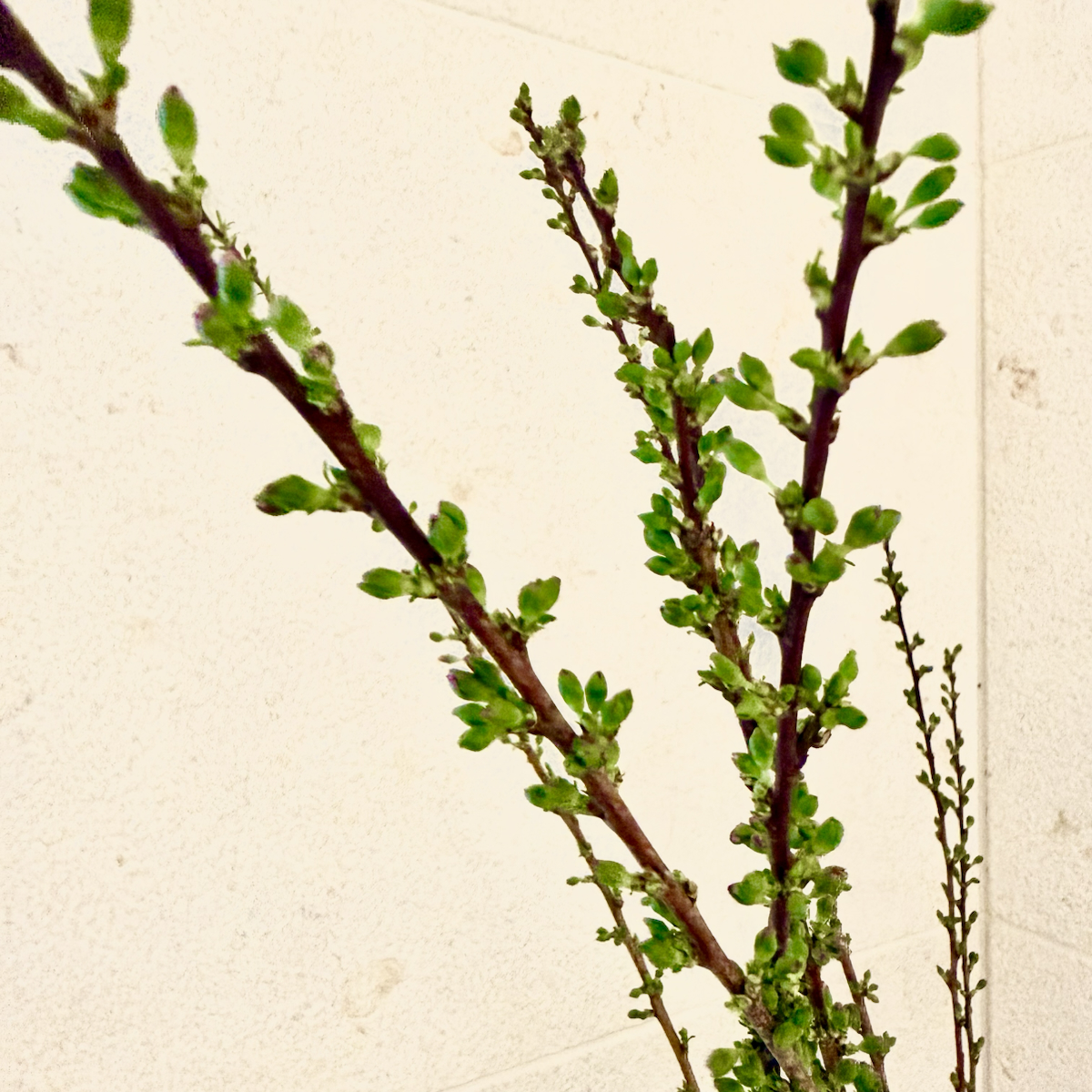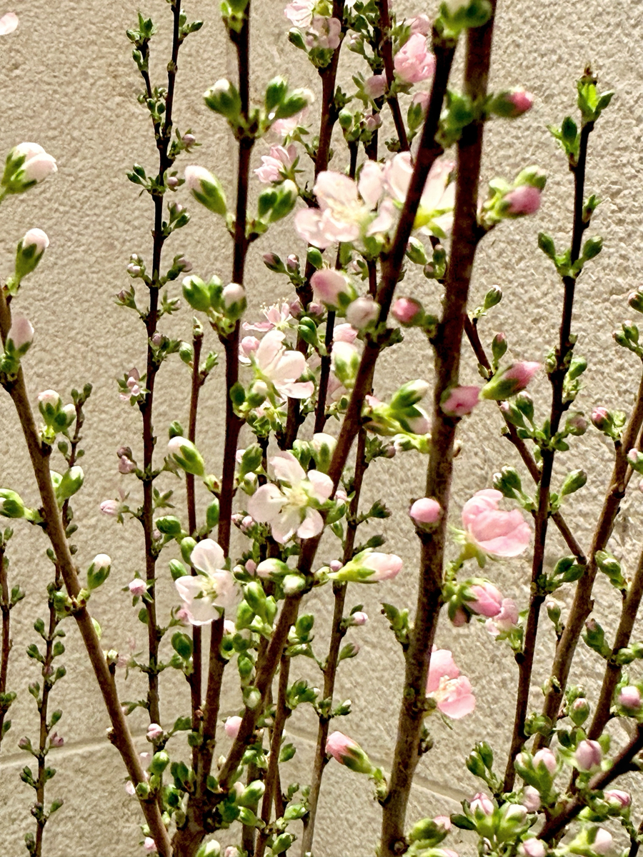 別名ニワウメ(庭梅)とも呼ばれ、3〜4月頃に梅に似た薄紅色の小花を枝いっぱいに咲かせ、夏には赤い果実をつけます。まだ咲いてないのが残念です。