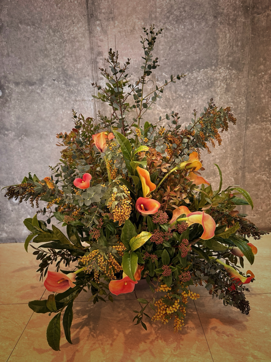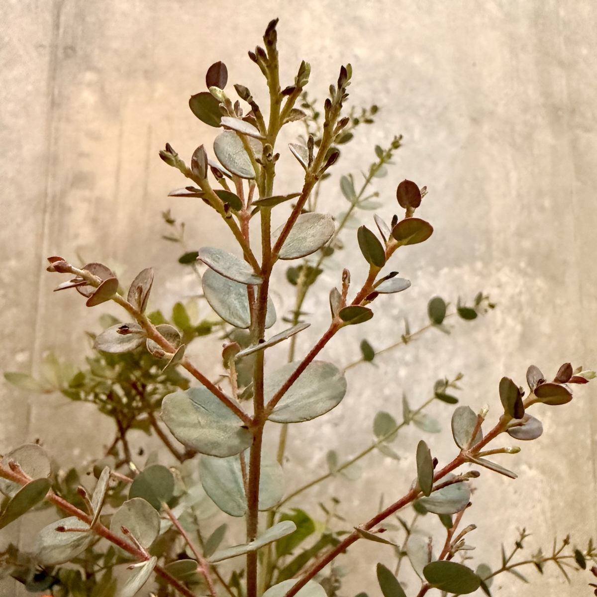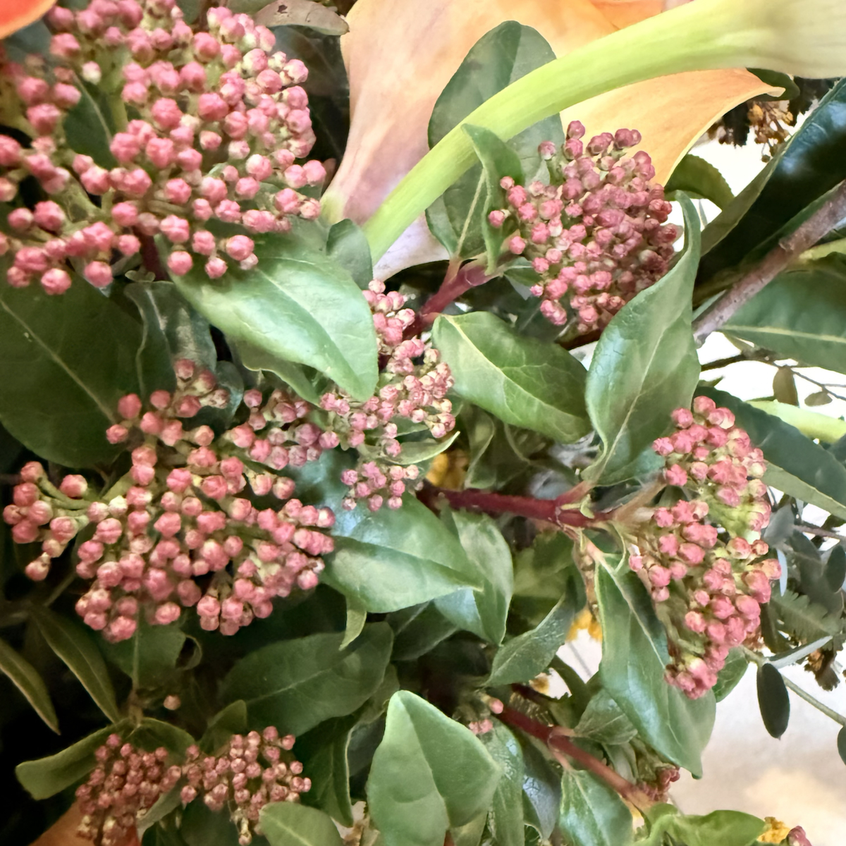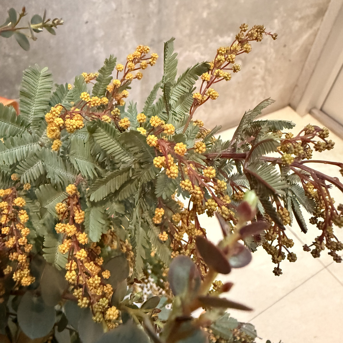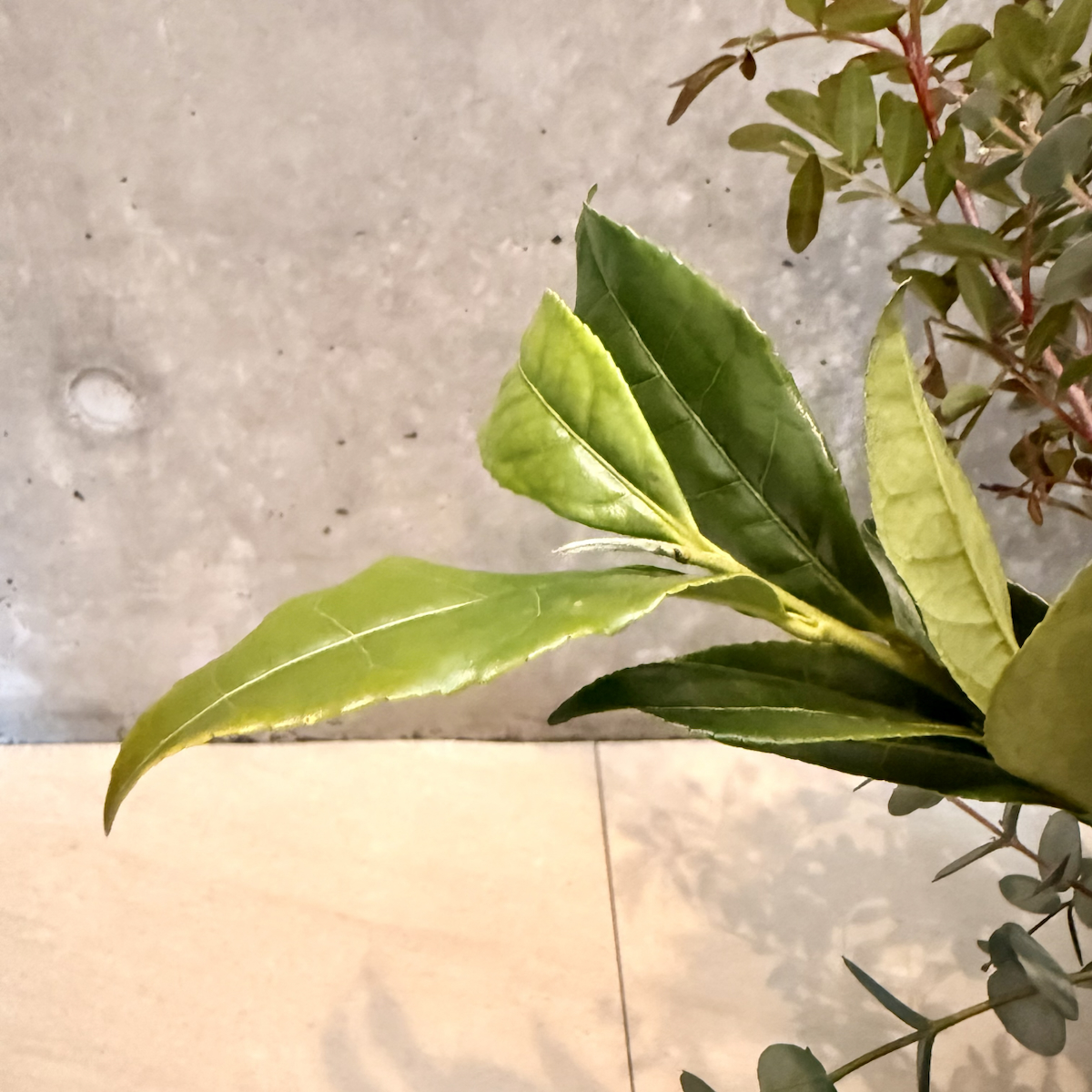 ミモザ、ユーカリ、カラー、ガマズミ、ピスタチオ、お茶の葉