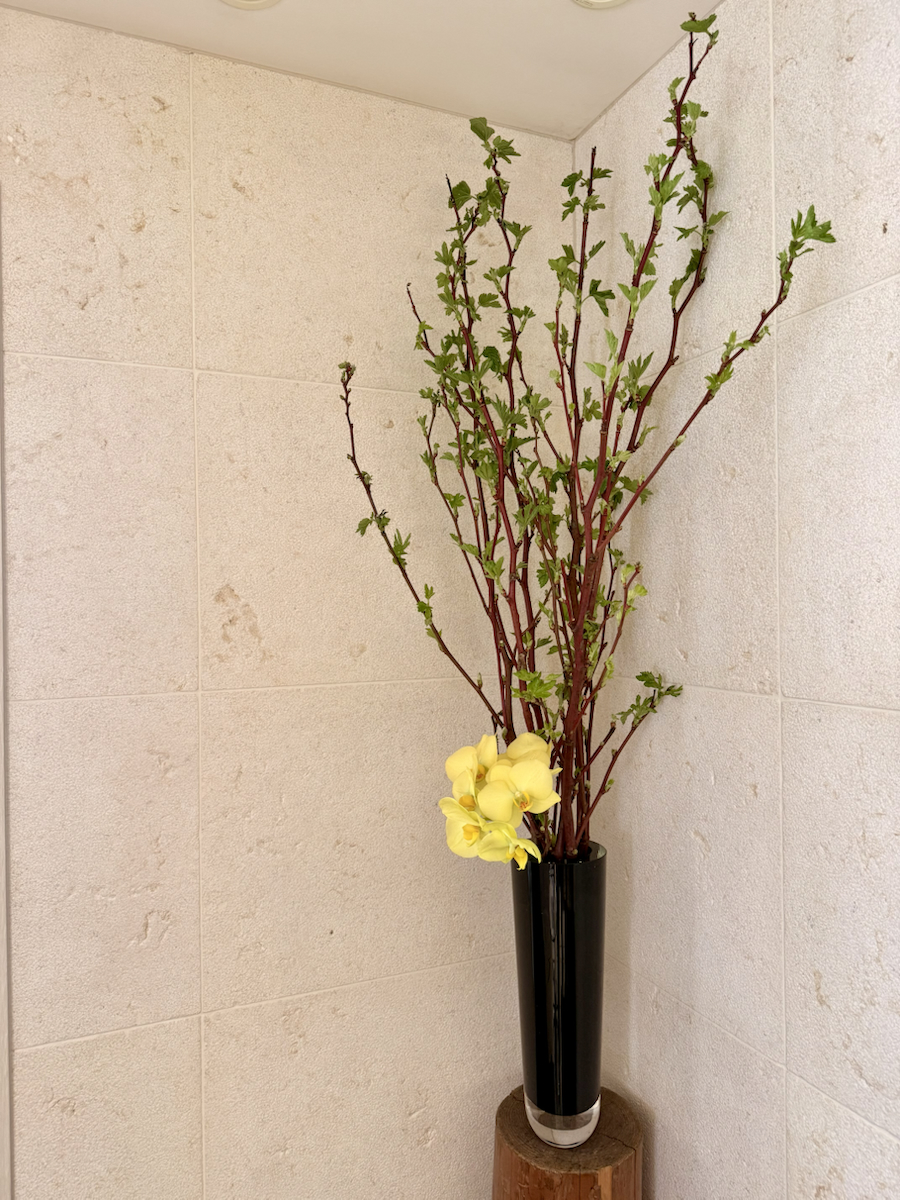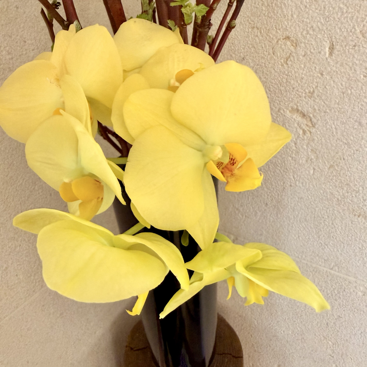 黄色い胡蝶蘭は珍しいので人気があります。花言葉は「金運」「商売繁盛」「元気」「明るさ」「幸運」です。アップでどうぞ!