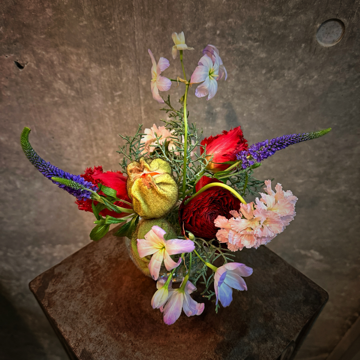 チューリップ、ポピー、スカビオサ、ベロニカ、リューココリーネ