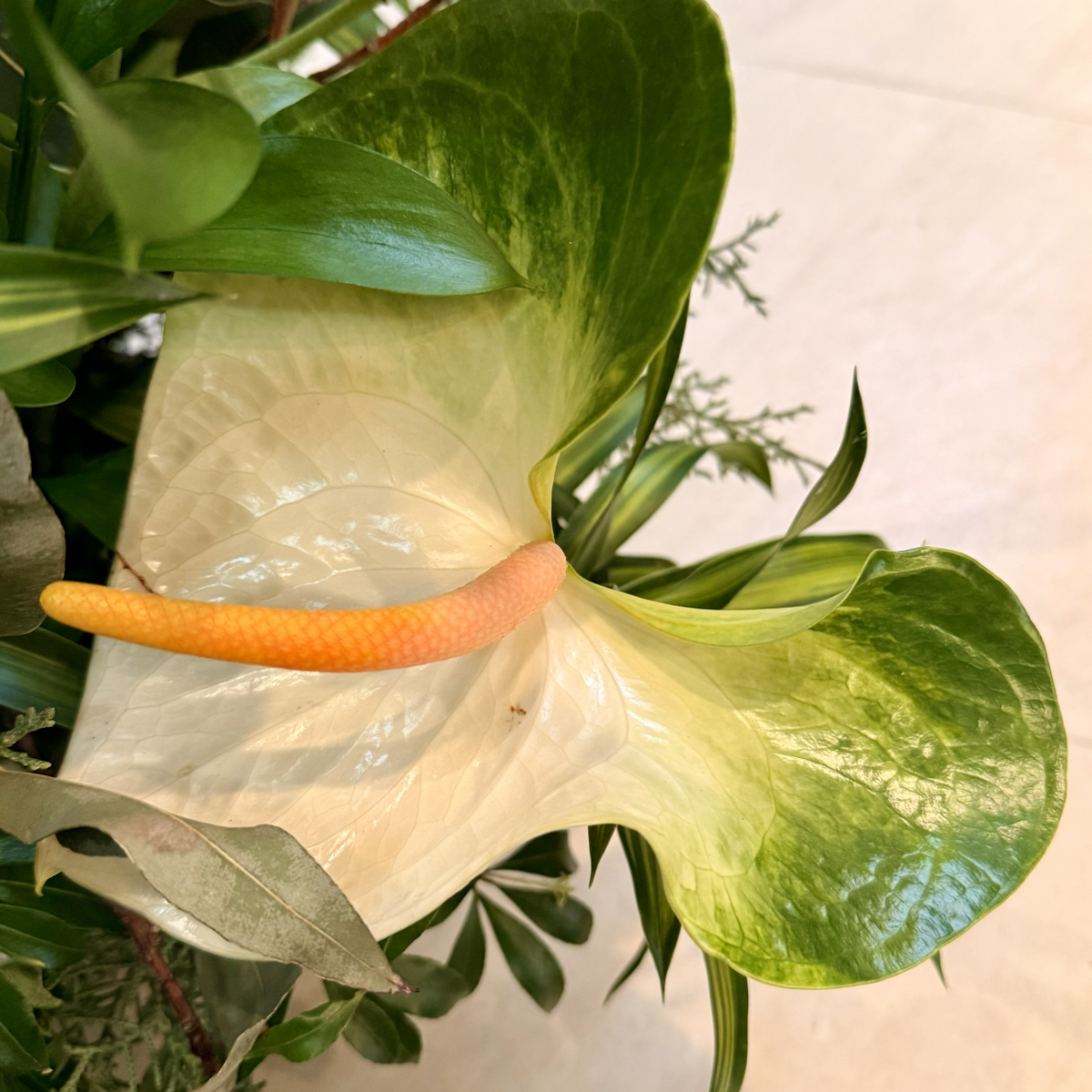 今回は白とグリーンのアンスリウムです。熱帯アメリカ原産のサトイモ科の植物です。
