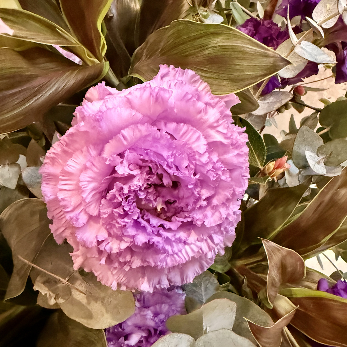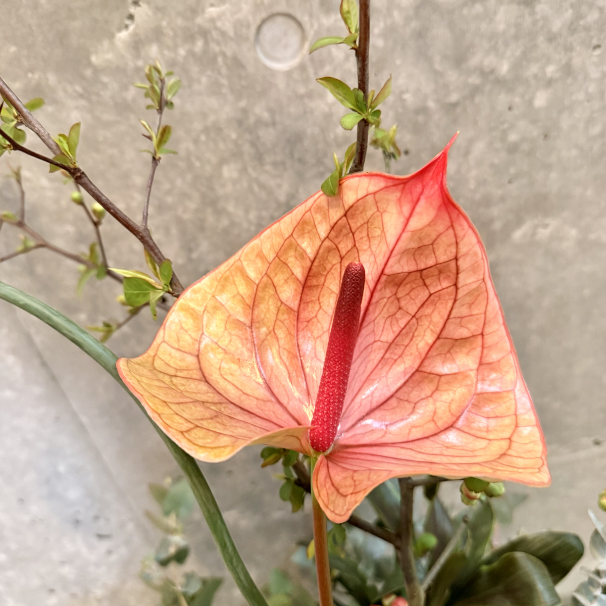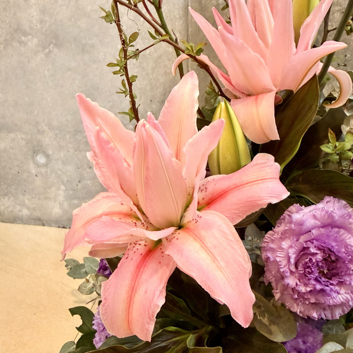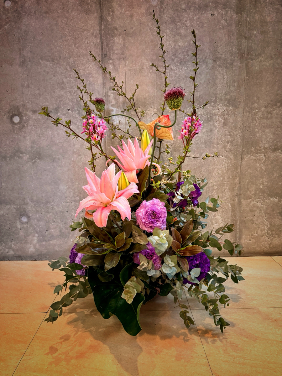 トルコキキョウ、ユーカリ、ボケ、丹頂アリアム、八重百合、エピデンドラム、アンスの葉、ドラセナ、アンスリウム、レモンリーフ